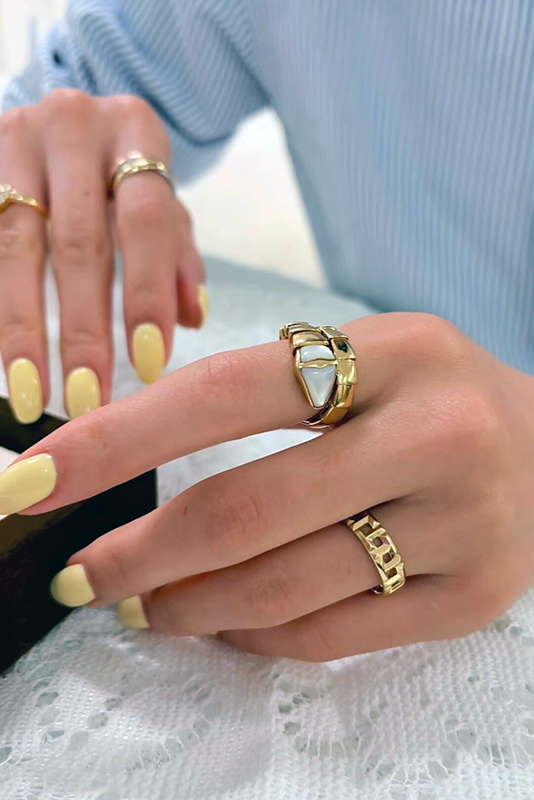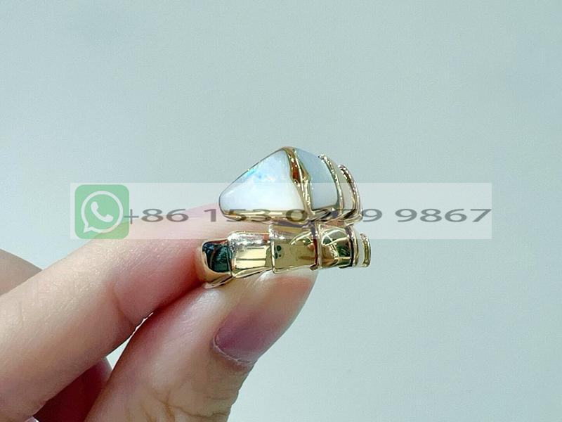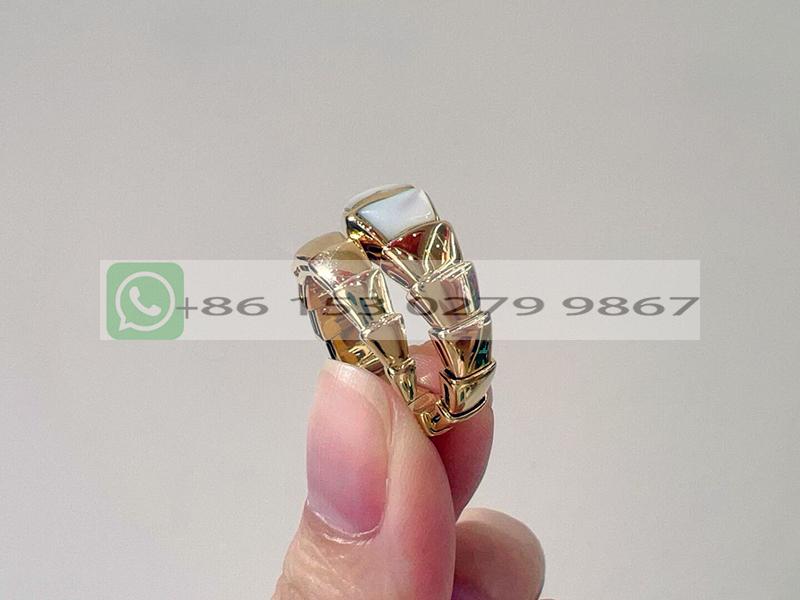 Bulgari anello modello intarsio in oro rosa 18kt con madreperla bianca e diamanti naturali taglio brillante. Misura 12,